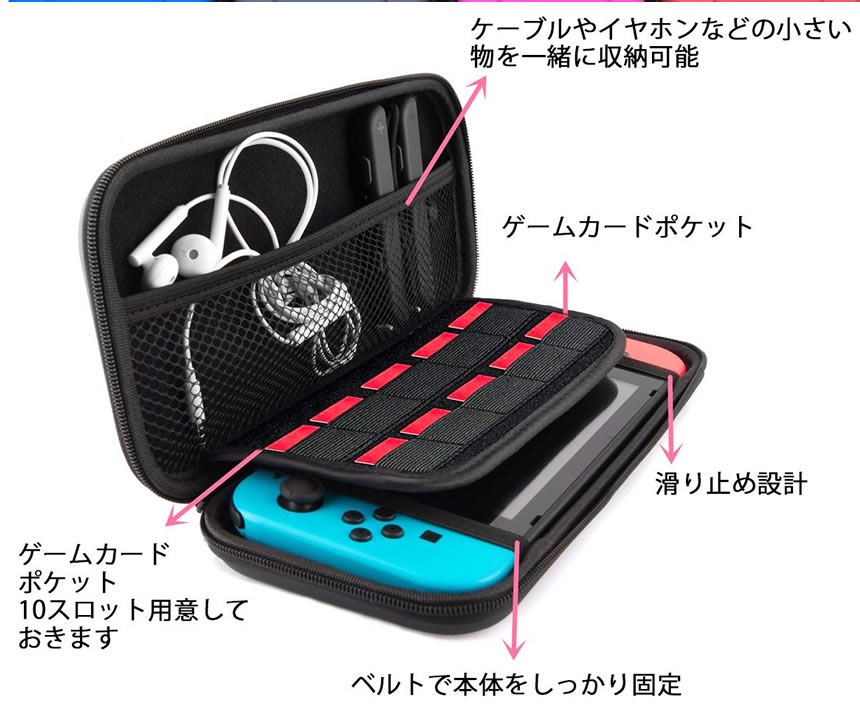 ゲームカード10枚収納可能 【商品詳細】 外サイズ:約26×13×5.3cm メイン素材:EVA カラー:黒、赤、青、ピンク 【注意】 ※Nintendo Switch本体は含まれません。